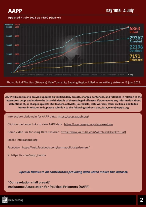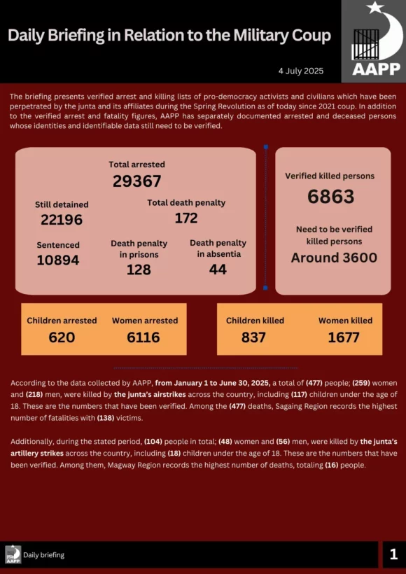 According to the data collected by AAPP, from January 1 to June 30, 2025, a total of (477) people; (259) women and (218) men, were killed by the junta’s airstrikes across the country, including (117) children under the age of 18. These are the numbers that have been verified. Among the (477) deaths, Sagaing Region records the highest number of fatalities with (138) victims.