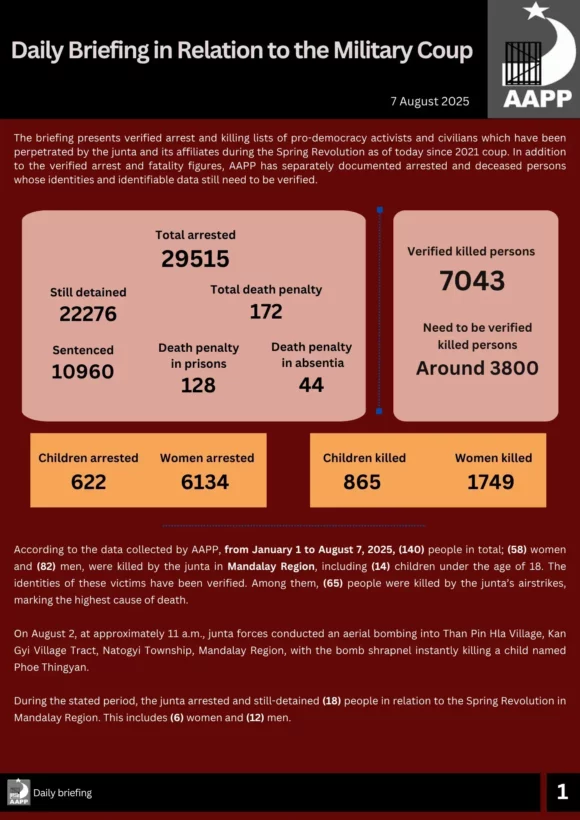 According to the data collected by AAPP, from January 1 to August 7, 2025, (140) people in total; (58) women and (82) men, were killed by the junta in Mandalay Region, including (14) children under the age of 18. The identities of these victims have been verified. Among them, (65) people were killed by the junta’s airstrikes, marking the highest cause of death.