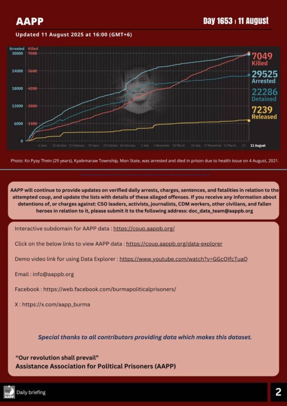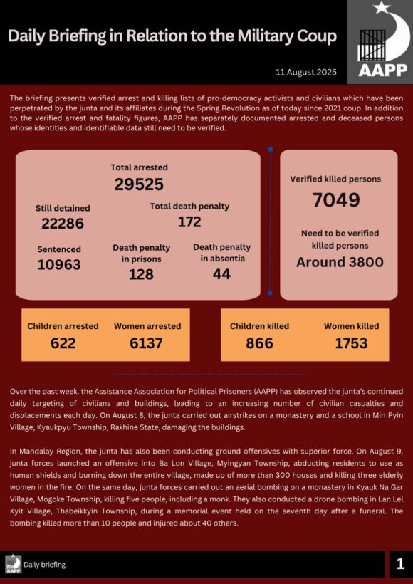 Over the past week, the Assistance Association for Political Prisoners (AAPP) has observed the junta’s continued daily targeting of civilians and buildings, leading to an increasing number of civilian casualties and displacements each day. On August 8, the junta carried out airstrikes on a monastery and a school in Min Pyin Village, Kyaukpyu Township, Rakhine State, damaging the buildings.