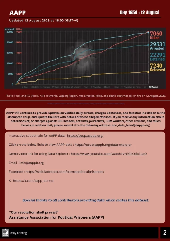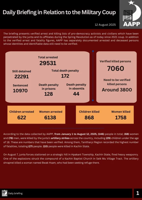According to the data collected by AAPP, from January 1 to August 12, 2025, (146) people in total; (68) women and (78) men, were killed by the junta’s artillery strikes across the country, including (29) children under the age of 18. These are numbers that have been verified. Among them, Tanitharyi Region recorded the highest number of fatalities, totaling (27) people. (10) people were killed in Kachin State.