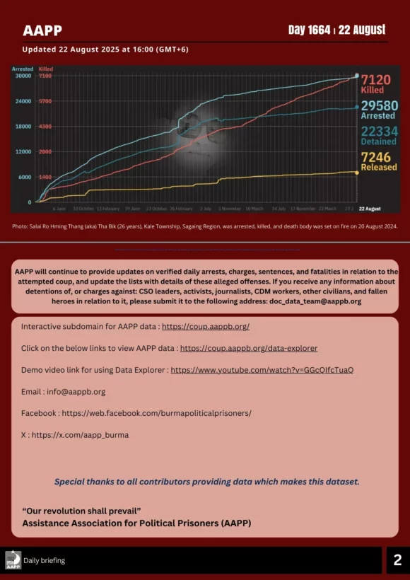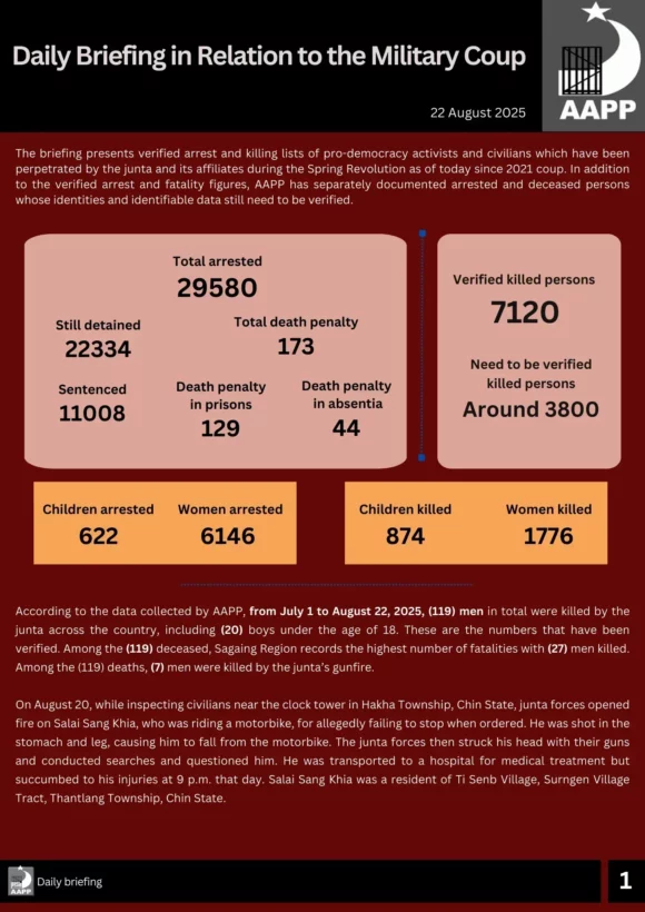 According to the data collected by AAPP, from July 1 to August 22, 2025, (119) men in total were killed by the junta across the country, including (20) boys under the age of 18. These are the numbers that have been verified. Among the (119) deceased, Sagaing Region records the highest number of fatalities with (27) men killed. Among the (119) deaths, (7) men were killed by the junta’s gunfire.