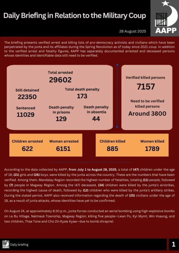 On August 24, at approximately 8:30 p.m., junta forces conducted an aerial bombing using high-explosive bombs on Le Bu Village, Natmauk Township, Magway Region, killing five people—Lwan Po, Kyi Myint, Win Hsaung, and two children, Thae Tone and Cho Zin Kyaw Kyaw—due to bomb shrapnel.