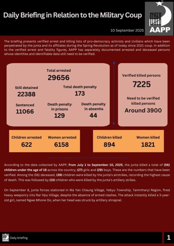 According to the data collected by AAPP, from July 1 to September 10, 2025, the junta killed a total of (56) children under the age of 18 across the country; (27) girls and (29) boys. These are the numbers that have been verified. Among the (56) deceased, (39)children were killed by the junta’s airstrikes, recording the highest cause of death. This was followed by (15) children who were killed by the junta’s artillery strikes.