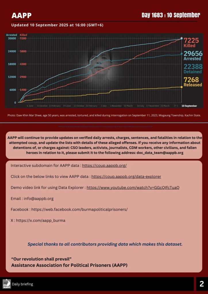 Since the 1 February 2021 coup, a total of (7,225) people, including pro-democracy activists and civilians, have been killed by the junta and pro-military groups during the Spring Revolution.