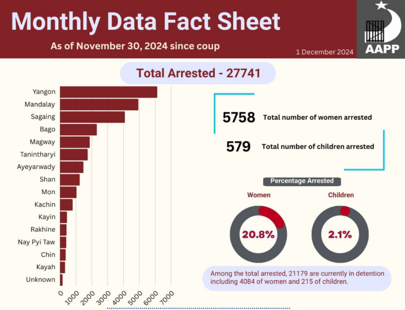 Graphs of arrest and death data as of November 30, 2024 collected and compiled by the Assistance Association for Political Prisoners (AAPP) since the February 1, 2021 military coup.December 1, 2024