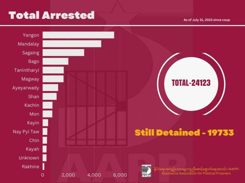 Graphs of arrest and death data as of July 31, 2023 collected and compiled by the Assistance Association for Political Prisoners (AAPP) since the February 1, 2021 military coupAugust 1, 2023