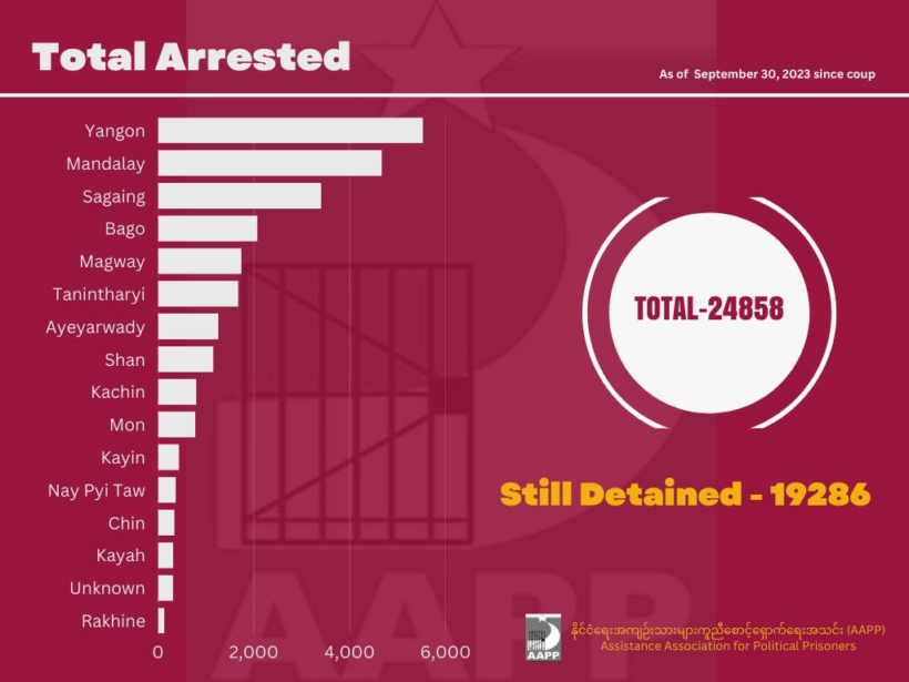 Graphs of arrest and death data as of September 30, 2023, collected and compiled by the Assistance Association for Political Prisoners (AAPP) since the February 1, 2021, military coupOctober 1, 2023