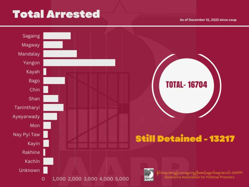 Graphs of arrest and death data as of December 31, 2022 collected and compiled by the Assistance Association for Political Prisoners (AAPP) since the February 1, 2021 military coupJanuary 1, 2023