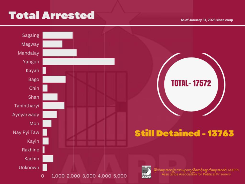 Graphs of arrest and death data as of January 31, 2023 collected and compiled by the Assistance Association for Political Prisoners (AAPP) since the February 1, 2021 military coup.February 1, 2023