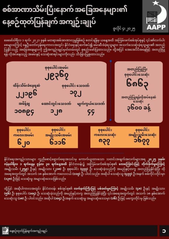 ဖော်ပြပါ ကိန်းဂဏန်းအရေအတွက်များသည် အေအေပီပီမှ လက်လှမ်းမီသမျှ ကောက်ယူရရှိထားသည့် အရေအတွက် ဖြစ်ပြီး မြေပြင်တွင် ဖြစ်ပွားနေသည့် အချက်အလက်များမှာ ယခုထက် ပိုမိုများပြားနိုင်ပါသည်။  အချက်အလက်များကို ထပ်မံကောက်ယူရရှိပြီး အတည်ပြုနိုင်ပါက ဆက်လက် ထည့်သွင်းဖော်ပြသွားမည်ဖြစ်သည်။