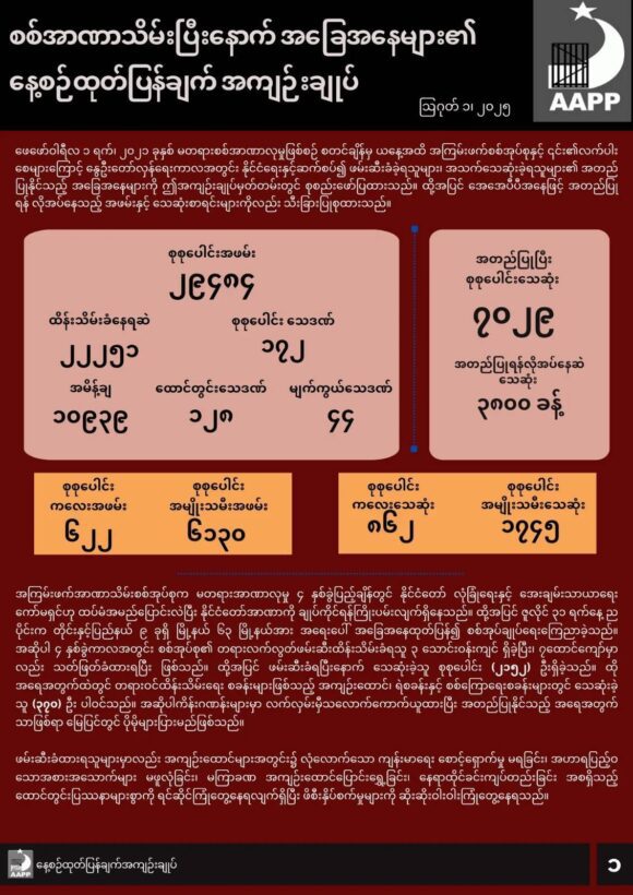 ဖော်ပြပါ ကိန်းဂဏန်းအရေအတွက်များသည် အေအေပီပီမှ လက်လှမ်းမီသမျှ ကောက်ယူရရှိထားသည့် အရေအတွက် ဖြစ်ပြီး မြေပြင်တွင် ဖြစ်ပွားနေသည့် အချက်အလက်များမှာ ယခုထက် ပိုမိုများပြားနိုင်ပါသည်။ အချက်အလက်များကို ထပ်မံကောက်ယူရရှိပြီး အတည်ပြုနိုင်ပါက ဆက်လက် ထည့်သွင်းဖော်ပြသွားမည်ဖြစ်သည်။