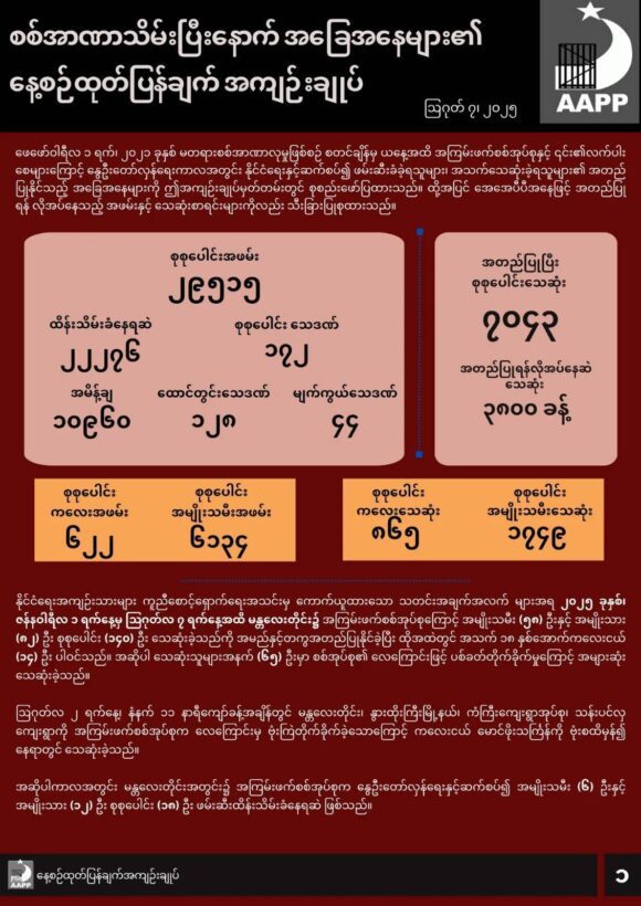 ဖော်ပြပါ ကိန်းဂဏန်းအရေအတွက်များသည် အေအေပီပီမှ လက်လှမ်းမီသမျှ ကောက်ယူရရှိထားသည့် အရေအတွက် ဖြစ်ပြီး မြေပြင်တွင် ဖြစ်ပွားနေသည့် အချက်အလက်များမှာ ယခုထက် ပိုမိုများပြားနိုင်ပါသည်။ အချက်အလက်များကို ထပ်မံကောက်ယူရရှိပြီး အတည်ပြုနိုင်ပါက ဆက်လက် ထည့်သွင်းဖော်ပြသွားမည်ဖြစ်သည်။
