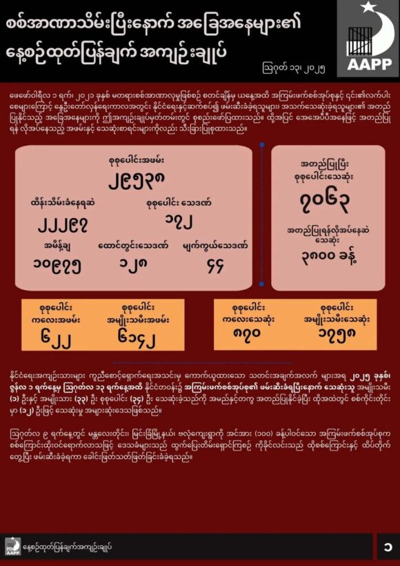 ဖော်ပြပါ ကိန်းဂဏန်းအရေအတွက်များသည် အေအေပီပီမှ လက်လှမ်းမီသမျှ ကောက်ယူရရှိထားသည့် အရေအတွက် ဖြစ်ပြီး မြေပြင်တွင် ဖြစ်ပွားနေသည့် အချက်အလက်များမှာ ယခုထက် ပိုမိုများပြားနိုင်ပါသည်။  အချက်အလက်များကို ထပ်မံကောက်ယူရရှိပြီး အတည်ပြုနိုင်ပါက ဆက်လက် ထည့်သွင်းဖော်ပြသွားမည်ဖြစ်သည်။