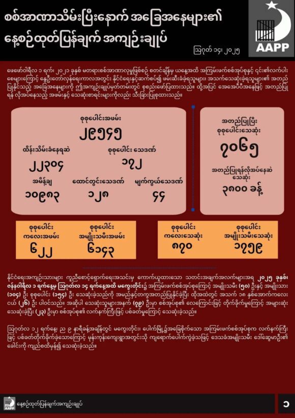 ဖော်ပြပါ ကိန်းဂဏန်းအရေအတွက်များသည် အေအေပီပီမှ လက်လှမ်းမီသမျှ ကောက်ယူရရှိထားသည့် အရေအတွက် ဖြစ်ပြီး မြေပြင်တွင် ဖြစ်ပွားနေသည့် အချက်အလက်များမှာ ယခုထက် ပိုမိုများပြားနိုင်ပါသည်။ အချက်အလက်များကို ထပ်မံကောက်ယူရရှိပြီး အတည်ပြုနိုင်ပါက ဆက်လက် ထည့်သွင်းဖော်ပြသွားမည်ဖြစ်သည်။
