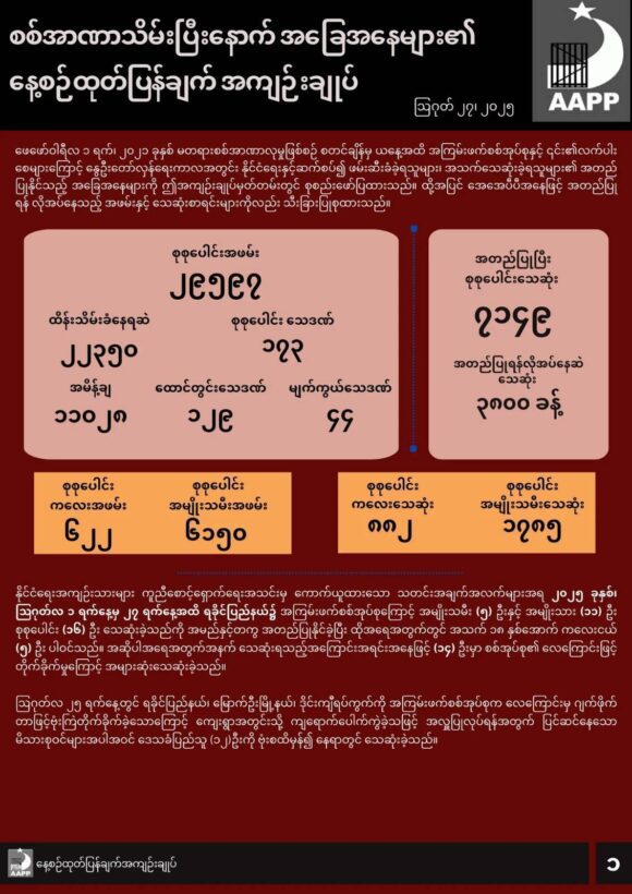 ဖော်ပြပါ ကိန်းဂဏန်းအရေအတွက်များသည် အေအေပီပီမှ လက်လှမ်းမီသမျှ ကောက်ယူရရှိထားသည့် အရေအတွက် ဖြစ်ပြီး မြေပြင်တွင် ဖြစ်ပွားနေသည့် အချက်အလက်များမှာ ယခုထက် ပိုမိုများပြားနိုင်ပါသည်။  အချက်အလက်များကို ထပ်မံကောက်ယူရရှိပြီး အတည်ပြုနိုင်ပါက ဆက်လက် ထည့်သွင်းဖော်ပြသွားမည်ဖြစ်သည်။