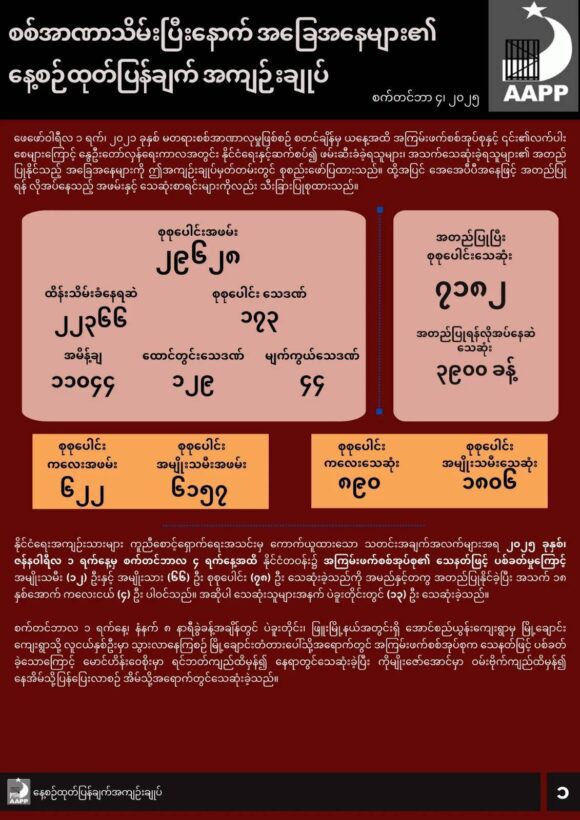 ဖော်ပြပါ ကိန်းဂဏန်းအရေအတွက်များသည် အေအေပီပီမှ လက်လှမ်းမီသမျှ ကောက်ယူရရှိထားသည့် အရေအတွက် ဖြစ်ပြီး မြေပြင်တွင် ဖြစ်ပွားနေသည့် အချက်အလက်များမှာ ယခုထက် ပိုမိုများပြားနိုင်ပါသည်။  အချက်အလက်များကို ထပ်မံကောက်ယူရရှိပြီး အတည်ပြုနိုင်ပါက ဆက်လက် ထည့်သွင်းဖော်ပြသွားမည်ဖြစ်သည်။