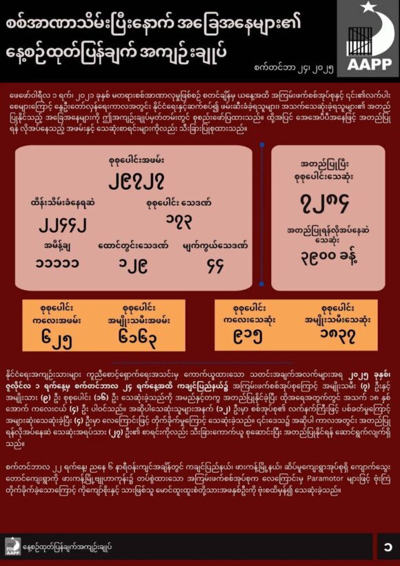 ဖော်ပြပါ ကိန်းဂဏန်းအရေအတွက်များသည် အေအေပီပီမှ လက်လှမ်းမီသမျှ ကောက်ယူရရှိထားသည့် အရေအတွက် ဖြစ်ပြီး မြေပြင်တွင် ဖြစ်ပွားနေသည့် အချက်အလက်များမှာ ယခုထက် ပိုမိုများပြားနိုင်ပါသည်။  အချက်အလက်များကို ထပ်မံကောက်ယူရရှိပြီး အတည်ပြုနိုင်ပါက ဆက်လက် ထည့်သွင်းဖော်ပြသွားမည်ဖြစ်သည်။