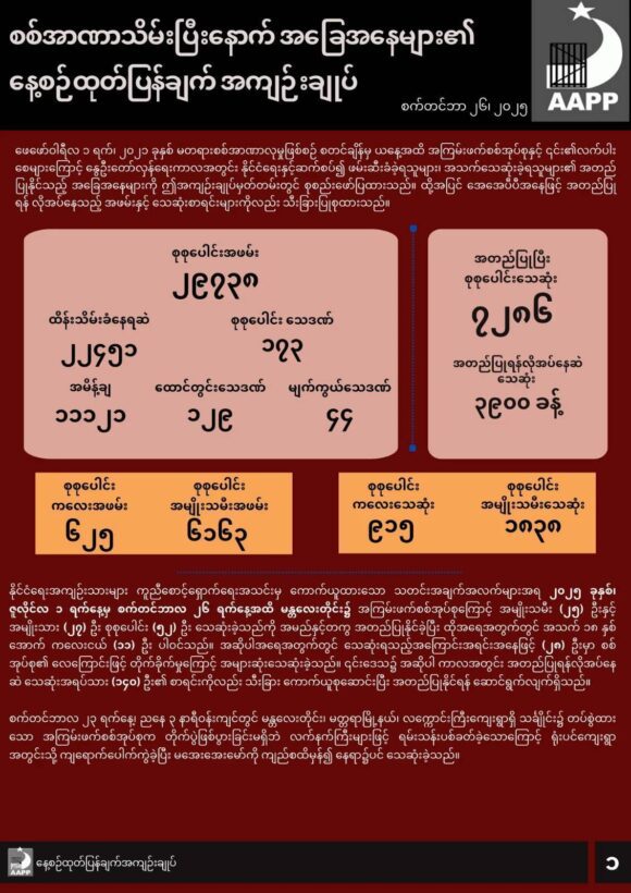 ဖော်ပြပါ ကိန်းဂဏန်းအရေအတွက်များသည် အေအေပီပီမှ လက်လှမ်းမီသမျှ ကောက်ယူရရှိထားသည့် အရေအတွက် ဖြစ်ပြီး မြေပြင်တွင် ဖြစ်ပွားနေသည့် အချက်အလက်များမှာ ယခုထက် ပိုမိုများပြားနိုင်ပါသည်။ အချက်အလက်များကို ထပ်မံကောက်ယူရရှိပြီး အတည်ပြုနိုင်ပါက ဆက်လက် ထည့်သွင်းဖော်ပြသွားမည်ဖြစ်သည်။