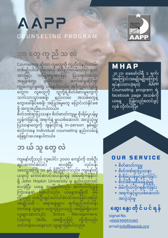 AAPP-MHAP သည် လူ့အခွင့်အရေး ကာကွယ်သူများ၊ ဒီမိုကရေစီ လိုလားသူများတွင် ခံစားရနိုင် သည့် စိတ်ဒဏ်ရာပြဿနာ၊ စိတ်ဖိစီးမှု၊ စိတ်ရောကိုယ်ပါ ပင်ပန်း နွမ်းနယ်မှု၊ စိတ်ဓာတ်ကျမှု၊ အရက်နှင့် မူးယစ်ဆေးဝါး အလွဲသုံးမှုနှင့် အခြားစိတ်ကျန်းမာရေး ဆိုင်ရာ ကိစ္စများအတွက် လိုအပ်သော စိတ်ကျန်းမာရေးအထောက်အကူပြုဝန်ဆောင်မှုများဖြင့် မြန်မာနိုင်ငံတနံတလျားတွင် လူ့အခွင့်အရေး မြှင့်တင်ပေးခြင်း၊ စိတ်ကျန်းမာရေး တိုးတက်ကောင်းမွန်အောင်ကူညီဆောင်ရွက်ပေးခြင်း၊ စွမ်းဆောင်ရည်မြှင့်တင်ပေးခြင်း၊ စည်းရုံးလှုံ့ဆော်မှုပြုလုပ်ပေးခြင်း နှင့်တာဝန်ခံမှုရှိစေရေးတို့အတွက် ဆောင်ရွက်နေပါသည်။