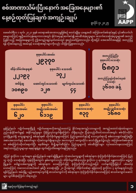ဖော်ပြပါ ကိန်းဂဏန်းအရေအတွက်များသည် အေအေပီပီမှ လက်လှမ်းမီသမျှ ကောက်ယူရရှိထားသည့် အရေအတွက် ဖြစ်ပြီး မြေပြင်တွင် ဖြစ်ပွားနေသည့် အချက်အလက်များမှာ ယခုထက် ပိုမိုများပြားနိုင်ပါသည်။ အချက်အလက်များကို ထပ်မံကောက်ယူရရှိပြီး အတည်ပြုနိုင်ပါက ဆက်လက် ထည့်သွင်းဖော်ပြသွားမည်ဖြစ်သည်။